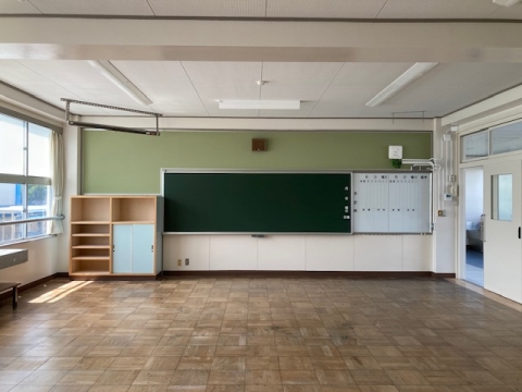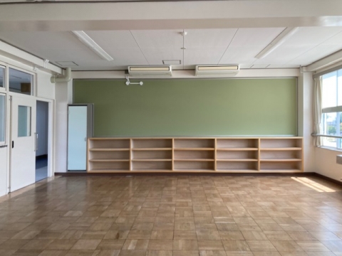 教室前方。ホワイトボード、黒板、棚が新しくなっています。照明はLEDです。
