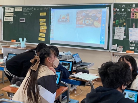 3限目(6年2組)。修学旅行の思い出を上村先生に伝えよう。