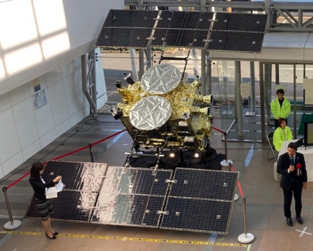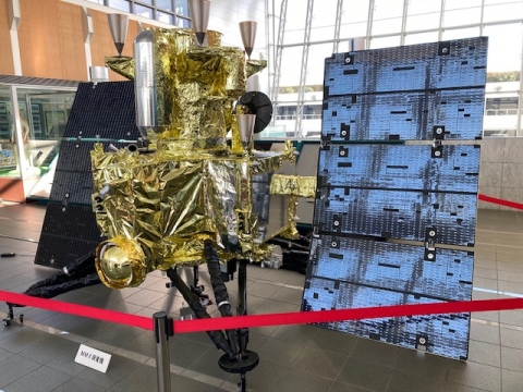 小惑星探査機はやぶさ2の実物大模型。大きいです。