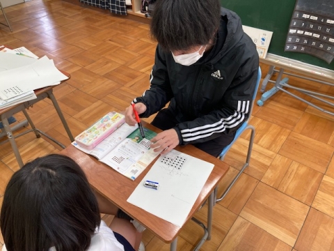 今日はマンツーマンです。●の個数をまとまりに注目し、九九をつかって計算します。通常の学級と同じ内容をわかりやすく学びます。