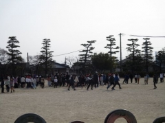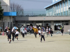 揺れが収まり運動場に避難するときには、校舎から避難してくる子も運動場にいた子も、クラスごとに整列をして人数確認しました。全員の無事を確認するのに約5分かかりました。運動場への避難時にはやや緊張がゆるみ話し声も聞こえてきました。
