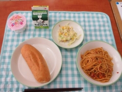 今日のメニューは、小型玄米パン・牛乳・ミートスパゲッティ・コーンサラダ・お祝いゼリーでした。残さず食べられたかな。
