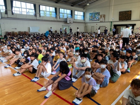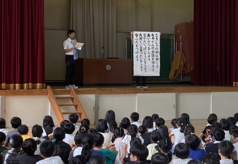 校歌斉唱、校長の話に続き、夏休みに頑張った人の表彰や紹介をしました。また、指導担当の教員から、羽津っ子のやくそく<6つのきまり>のお話しをしました。
