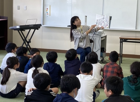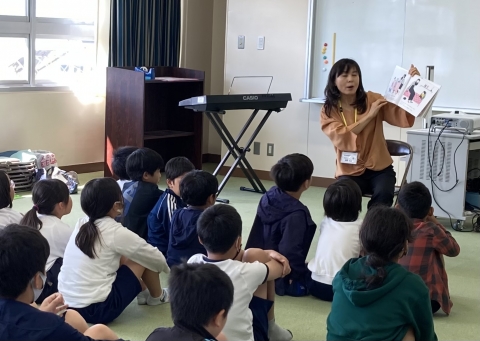 10月10日(火)いきいきタイム(20分休み)、視聴覚室で絵本の読み聞かせ会がありました。まざりぃずのみなさんです。