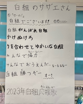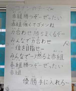 運動会は赤組・白組に分かれて競技します。それぞれに応援歌があるようで、大きく掲示してある教室がありました。