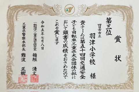 7月8日(土)、第54回交通安全子ども自転車三重県大会において、羽津小学校は3位に入賞しました。