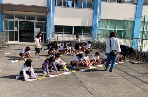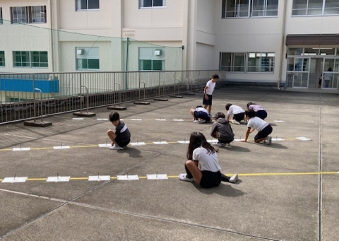 影がはっきり見えます。時間ごとに影を記録し、太陽の動きを追いかけるようです。
