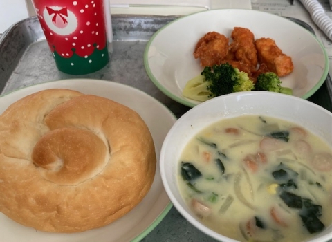 12月20日(水)、今日の給食は米粉パン、はっこう乳、フライドチキン、ゆでブロッコリー、クリームシチュー。クリスマスをイメージしています。