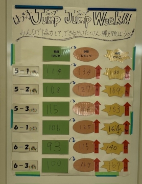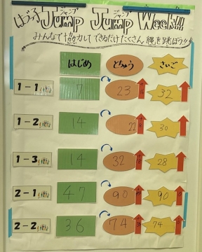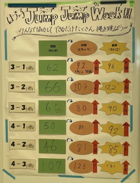 なわとび週間の取り組みの一つ「長なわ8の字とび」。各クラスが記録の更新に取り組みました。結果が出そろいましたので紹介します。