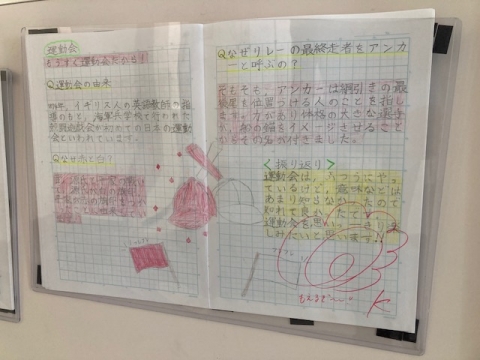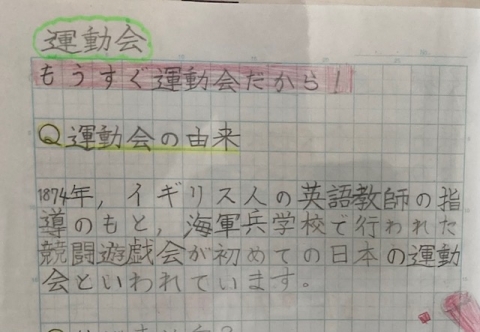 9月15日(金)、5年生の廊下に掲示されていた自主学習ノートの中に、おもしろいものがありました。テーマは運動会。「もうすぐ運動会だから!」とあります。内容は次のことが書いてありました。