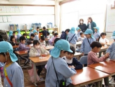 次に1年生の教室へ行き、2組では算数の足し算ができるようになった1年生の発表を聞いて、みのりさんの子どもたちも計算問題を先生から出してもらうと、頑張って答えを発表しました。1組の教室ではこま回しを1年生に教えてもらって楽しみました。