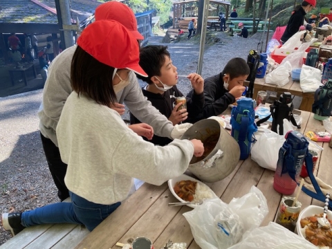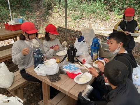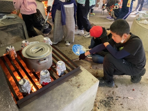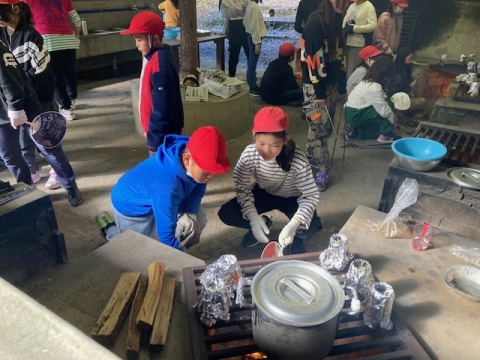 2日目は朝食をとり、部屋の片づけをしたらもう野外炊事。食事を用意すること、後片付けをすることの大変さを実感できたはずです。