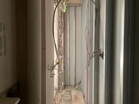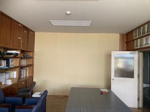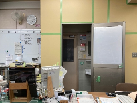 職員室の出入り口に設けられた壁。工事の方が出入りするためのドアも設けられています。奥に見えるのは校長室のドア。