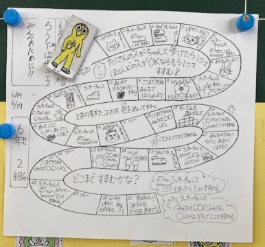教室に掲示されていた「ろうかは歩こうすごろく」。たくさんの人がちゃんと歩けたら1コマ、ほとんどの人がOKならもう1コマすすむ!とのこと。