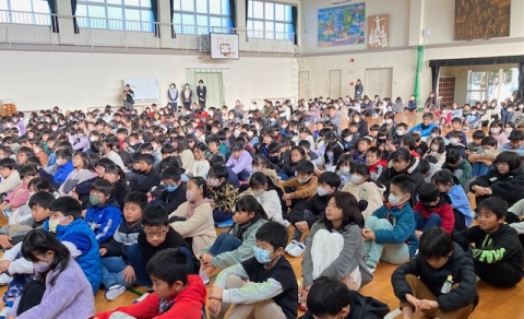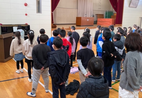 1月9日(火)、3学期の始業式を行いました。みんなで校歌を歌い、校長が話をしました。さらに、大谷翔平選手からいただいたグローブをお披露目しました。