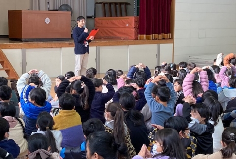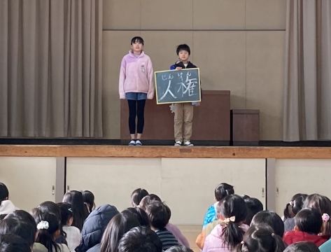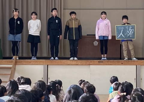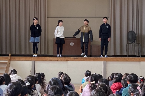 校歌斉唱、6年生による人権フォーラムの報告(寸劇)、校長の話、冬休みの生活についての話をしました。