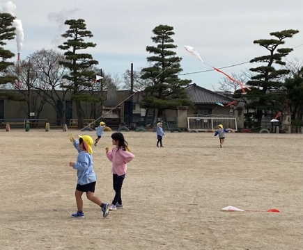 12月19日(火)給食の時間、運動場で凧あげをしている子どもたちがいます。羽津幼稚園の園児たちが、思い思いの絵を描いた凧を持ってやってきました。
