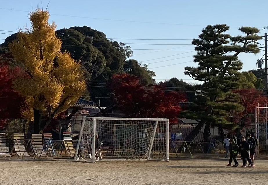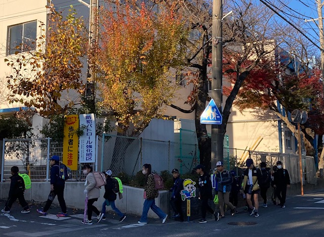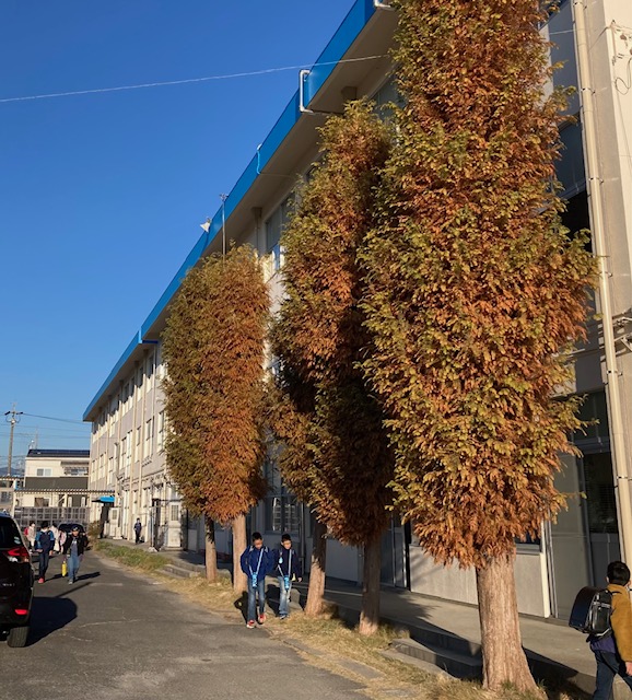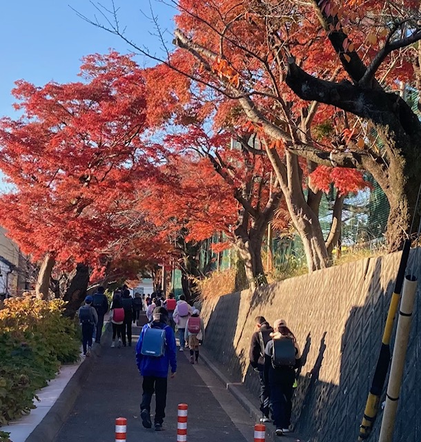 12月6日(水)の登校の様子です。羽津小学校には紅葉(黄葉)する落葉樹が多く、この季節には色の変化を楽しむことができます。今朝はよく晴れたので、特にきれいです。