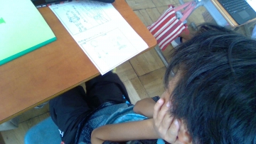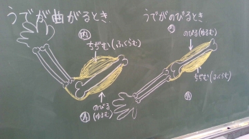 上腕二頭筋が縮んでふくらむと腕が曲げられる、それと同時に上腕三頭筋はのびてゆるむ、という筋肉の仕組みを学びました。