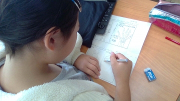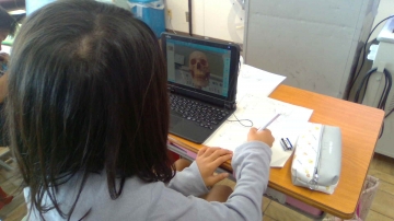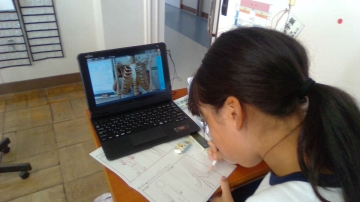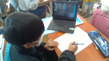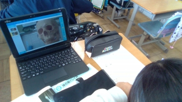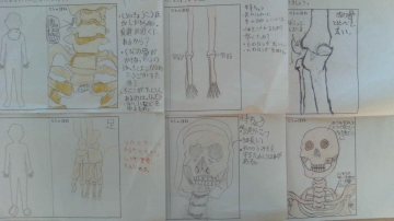 その後、がいこつに登場していただき、好きな箇所をタブレットで撮影し、拡大、スケッチしました。