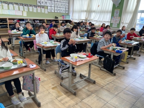 1月10日(火)、給食がはじまりました。給食委員会の「給食のお話」によると、1月の給食目標は「給食について調べましょう」で、「今の給食は食事について学ぶ大切な機会になっています」ということだそうです。