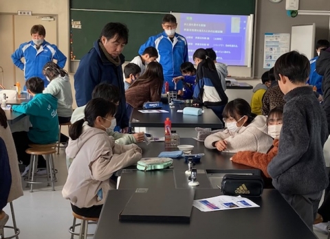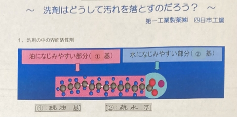 1月17日(水)、6年生理科「私たちの生活の中の水溶液」の実験です。界面活性剤の働きで泥汚れや油汚れを落とす仕組みを、第一工業製薬(株)四日市工場のみなさまに教えていただきました。四日市市の企業連携授業の一環です。