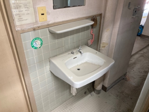 壁で仕切られて以降使えていない職員室の洗面台。断水の前から水は出ません。数mm程粉塵が堆積しています。
