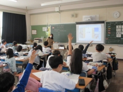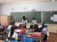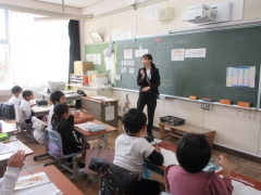 1年生では、ひらがなの学習が始まっています。 今日は「へ」の書き方を学習しました。先生のお手本をよく見ながら、ゆっくりと筆順を確かめて書く子、書き終えると「できたよ」と嬉しそうに見せてくれる子など、一人ひとりが集中して取り組む姿が見られました。また、「へ」を使った言葉集めにも挑戦しました。「へび」「へや」など、子どもたちは思いついた言葉を元気に発表し、教室は楽しい声でいっぱいになりました。