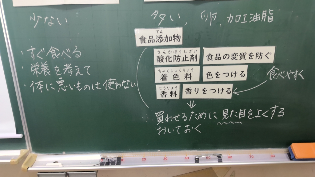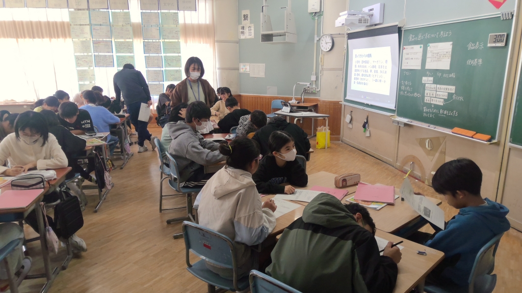 6年生、食育の授業。今日は栄養教諭が指導者として前に立ち「給食のパンと市販のパンの成分比較」から考えあう時間を持ちました。