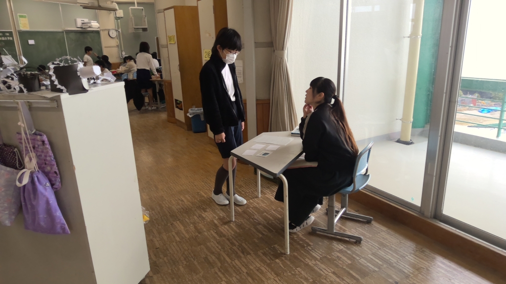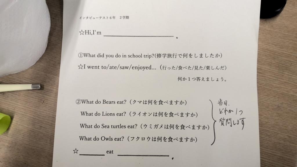「My name is ~」に続いて、修学旅行に関する質問などの受け答えを6年生が行っていました。少し緊張しながらも、覚えた構文や単語を使い、受け答え。英語で意思疎通できると「通じた」「聞き取れた」「わかった」とうれしさが積みあがっていきます。こつこつと英語に親しみ、活用する6年生です。