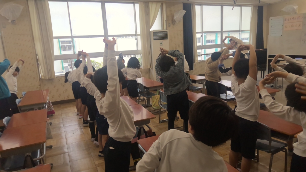 首や身体を伸ばしたり曲げたりする軽いストレッチやジャンプなどを軽快なピアノ伴奏に合わせて行います。4年生も自然とリラックスした表情に。