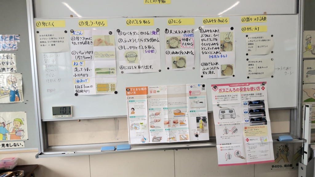 今日は「出汁の取り方」を学び、みそ汁作り。にぼしをから旨味をとりだして、大根や油揚げ等の食材と合わせていきます。