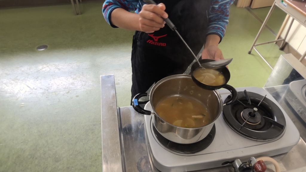手軽なインスタント食品も流通していますが、従来の手順も大切です。丁寧に調理し「美味しい」と呟く5年生です。