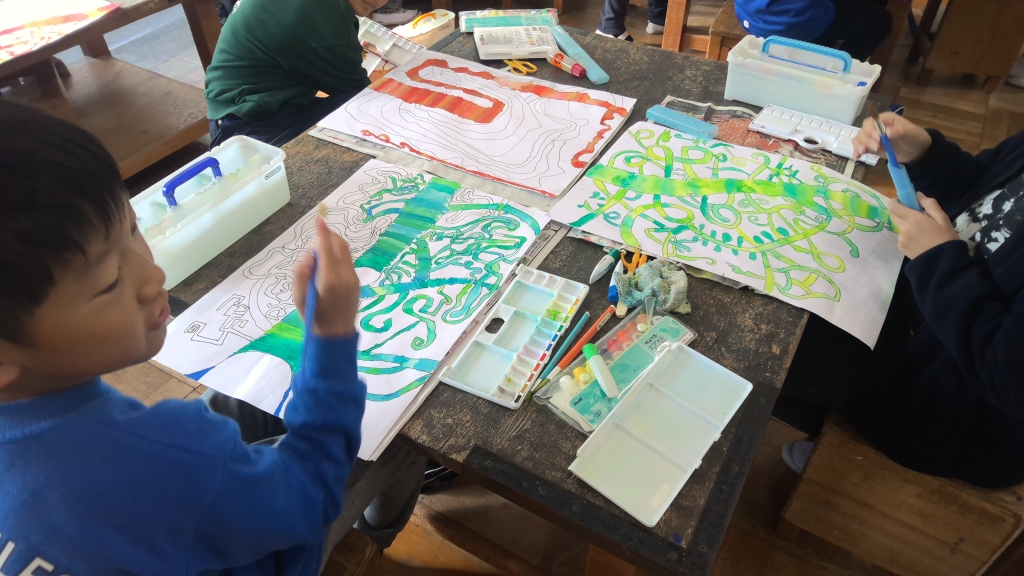 5年生図工「水彩画」。題材は「迷路のような不思議な木」。