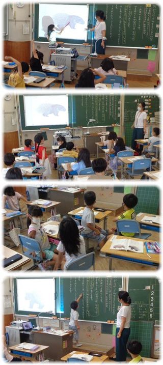 子どもたちは、映された絵を指さしながら、絵を見て気づいたことや知っていることを口々に話しますが、今は国語の学習。