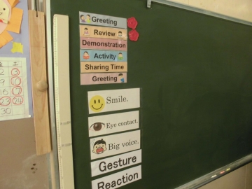 本校では、英語の授業は、写真のように、黒板左隅に掲示した学習展開によっていつも進められています。