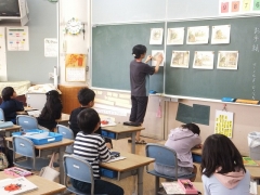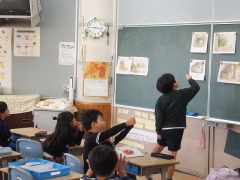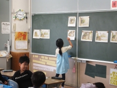 2年生の国語の題材は「お手紙」。この物語の挿絵が並べてあります。順番は違います。この題材の授業は3回目。物語全体を読んで、主人公の気持ちの移り変わりを把握する中で、挿絵を順番に並べていきます。「一番初めはどれ?」「次は?」「なぜそれだと思ったの?」・・・主人公の気持ちの移り変わりを知っている日永っ子は一生懸命順番を説明します。「早くから物語の流れをつかんでいて素敵です!」そんな先生の声が聞こえます。楽しく国語の授業をしています。
