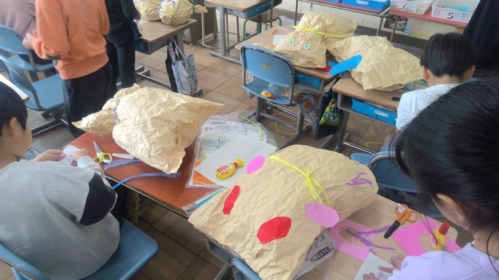 大きな紙袋に詰め物をすると大きなクッションに。そこに思い思いにデコレーションして「ぎゅっとしたい私の友だち」を作ります。