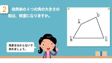今は、三角形の内角の和が180度であることを使って四角形、五角形・・の内角の和を求める学習です。