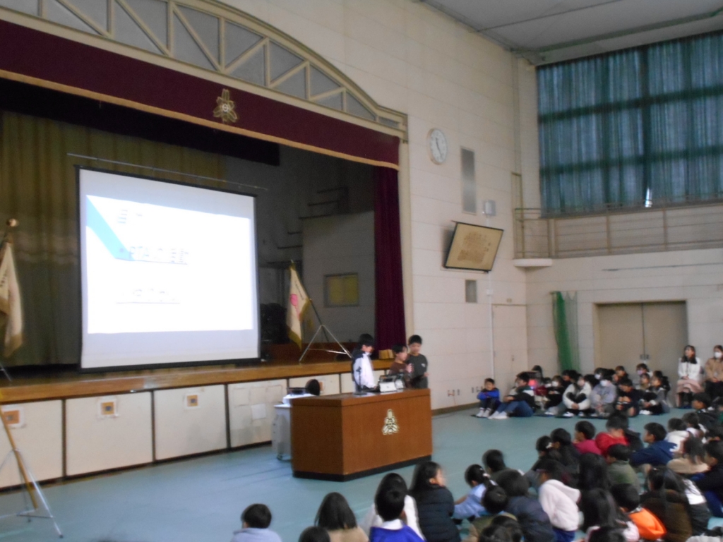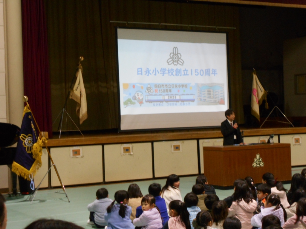 校長から「日永小の歴史」、PTA会長より「校旗贈呈」、全校「校歌斉唱」、6年生より「日永小と地域」「日永小の人権教育」「日永小の学校目標~つながる~」についての発表、全校斉唱「世界がひとつになるまで」。