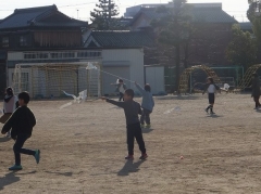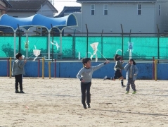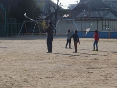 本日の1限目に2年生のあるクラスが凧あげをしていました。自分で作った凧を楽しそうにあげています。今日は寒いですがちょうど風も吹いていて絶好の凧あげ日和です。なかなかうまくいかず凧を地面にひきずっている日永っ子もいます。元気よく走りまわって凧あげを楽しむ日永っ子たちでした。