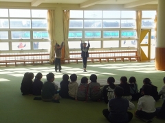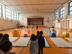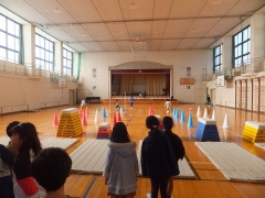 体育館では3年生のあるクラスが「ゆきだるまさんがころんだ」をしていました。いろいろな障害物があるみたいですね。