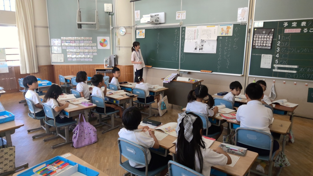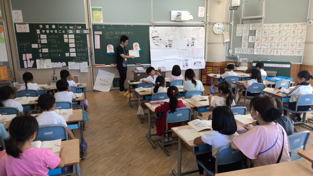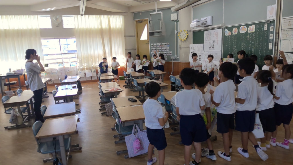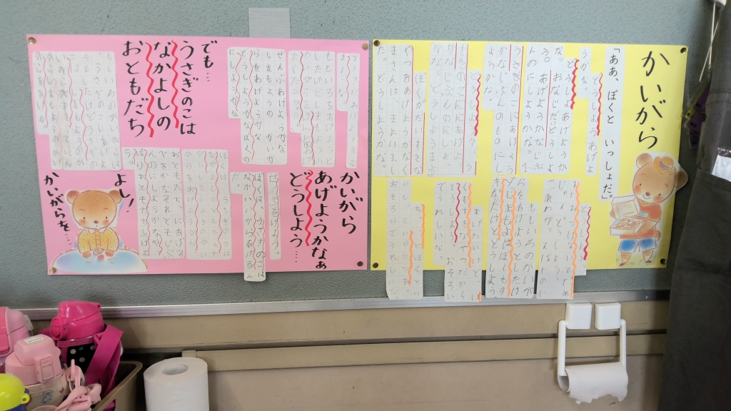 あらすじ…くまのこが、うさぎのこにいった。「うみでかいがらをひろってきたよ。うさぎちゃんは、どれがすき。」「これがいちばんすき。」うさぎのこは、しまもようのかいがらをさした。「ああ、ぼくといっしょだ。」くまのこも、おなじものがいちばんすきだった。もし、うさぎのこがももいろのかいがらをすきだといったら、おみやげにあげるつもりだった。ももいろのかいがらは、二ばんめにきにいっていた。くまのこは、どうしようかとおもった。そして、かいがらをしまってうちにかえった。そのよる、くまのこは、いっしょうけんめいかんがえた。つぎのひ、くまのこは、しまもようのかいがらをもって、うさぎのこのところへいった。「うさぎちゃん、あげるよ。」「だって、それは、いちばんすきなものでしょう。」「うん。だから、あげるんだ。」くまのこは、だいすきなともだちに、いちばんいいものをあげようときめました。「ほんとうにありがとう。」うさぎのこは、かいがらをみみにあてて、「なみのおとがきこえてきそう。」とにっこりした。くまのこも、ももいろのかいがらをとりだし、みみにあて、うさぎのこをみてにっこりした。 1年生は、くまのこ、うさぎのこの優しさや思いやりの気持ちを考え伝え合ったり、音読表現したりして物語の世界を楽しみ、読む力を自然と高めています。