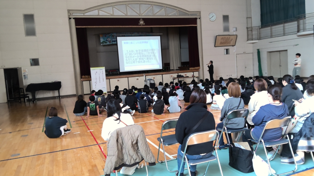PTA主催、人権講演会が開催されました。保護者の方と6年生が「ネットの安全な利用方法」について学び合いました。講師は四日市市青少年育成室で、普段四日市市の若者の相談育成に携わっている方です。