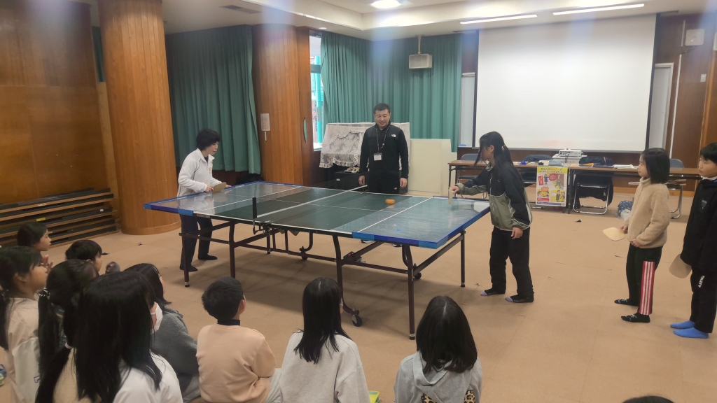 |   | |  | | 4年生が、SSピンポンを体験。社会福祉協議会の方々をゲストティーチャーにお招きし、用具をお借りして実際にプレーさせていただきました。 SSピンポンは卓球台の上で中に 金属球が入った転がすと音がす るオレンジ色の球と、ラバーなし のラケットを用い、テーブルとネ ットの間の隙間をくぐらせる競技 です。 子どもから大人まで誰で も参加できるスポーツです。 三重県内の視覚障がい者の方々が2015年に考案したもので、「SS」は「生涯」「スポーツ」の頭文字。カラカラと音が出るピンポン球とラバーを貼っていないラケットを使い、球を卓球台とネットの隙間に転がすようにして打ち合う。障害の有無に関係なく参加でき、高齢者も楽しめるのが魅力の競技です。 ゲストティーチャーの中に、なんと今年度全日本選手権優勝者の方が。全盲とは思えない球さばきでラリーを4年生としていただけました。見えている4年生もなかなかポイントが取れません。音だけでボールの位置を察し、迷わずヒットするフォームはまさに競技者。そしてなによりも笑顔で楽しそうにプレーされる姿にひきつけられる4年生です。  | | | | |