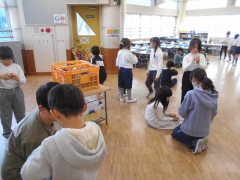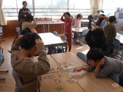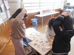 1年生の「昔のくらし」を学ぶ取り組みです。コマ回しをするクラスやカルタ取りをしているクラスがありますね。真剣さの中にも楽しく学ぶようすが伝わってきます。