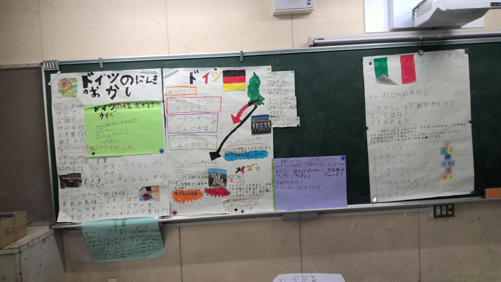 その成果として、関心を深めた国について調べ、プレゼンコーナーを作りました。担当者が発表しながら説明をしていきます。各クラスが自由に回り、お互いの成果を聴き合う形式です。