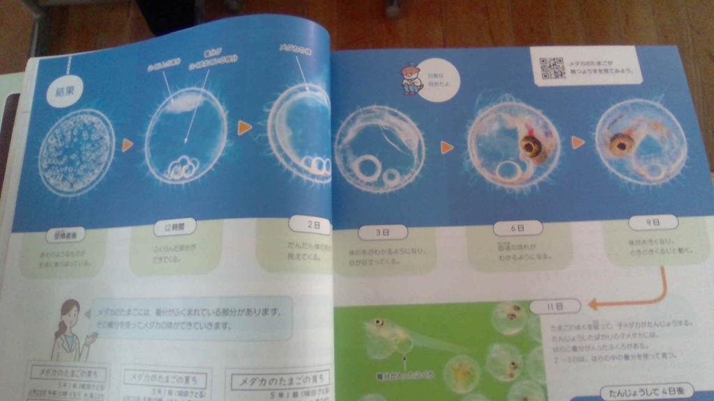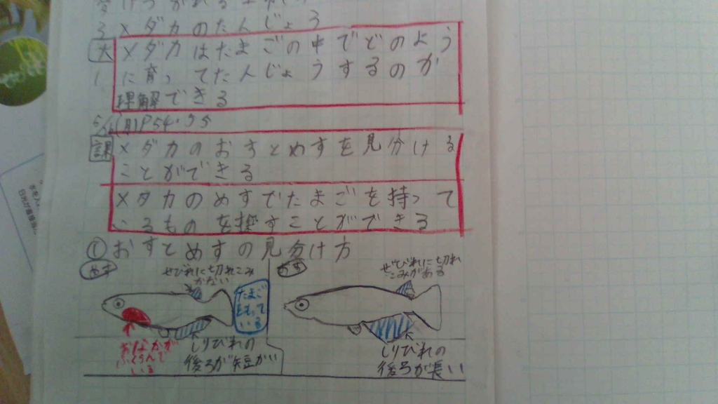 廊下で飼育しているメダカも、産卵していきます。これからたまごの育ちを観察していくための予習をする5年生。