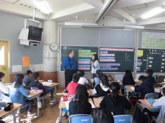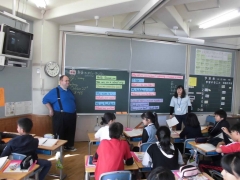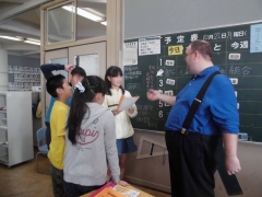 ★担任の先生(子ども役)とカーリー(外国人旅行客)のやり取りを見ます。