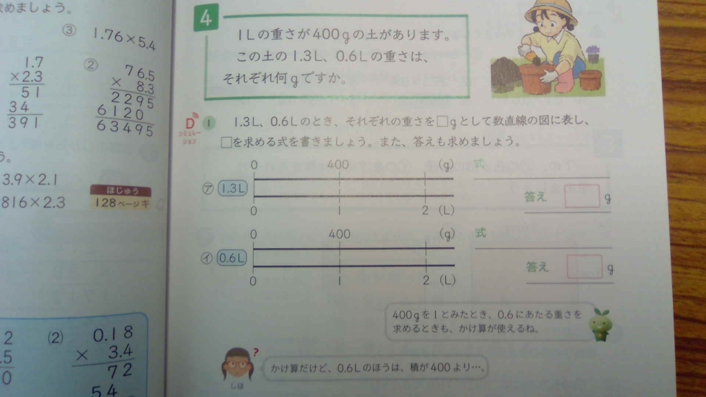 例題「1Lの重さが400gの土があります。この土の1.3L、0.6Lの重さは、それぞれ何gですか?」を考えます。